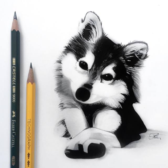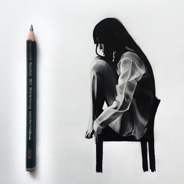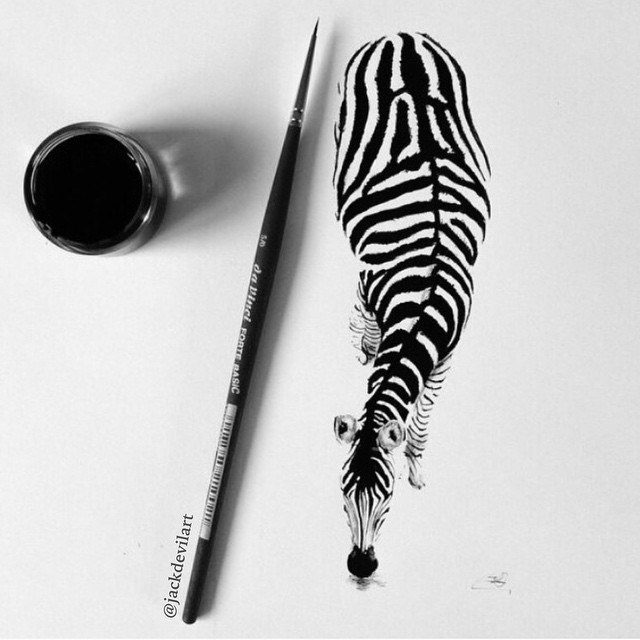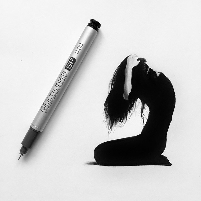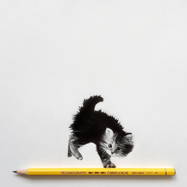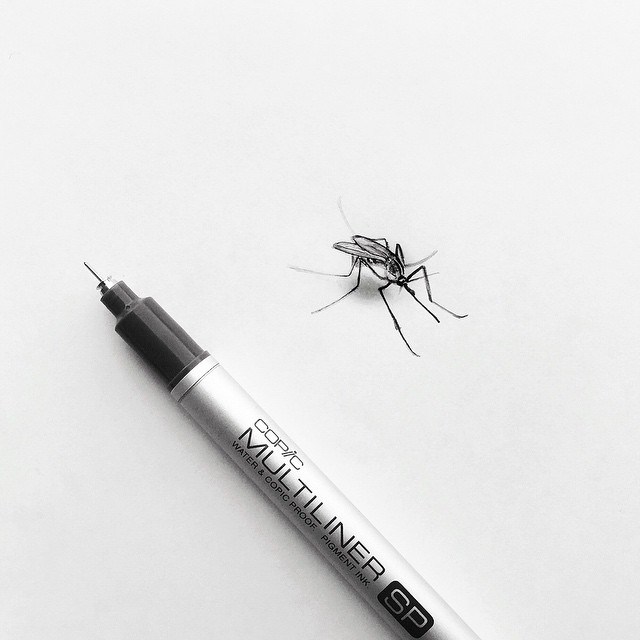 O trabalho da artista sueca Johanna chama atenção pelo exato oposto. Com o uso de canetas finas e lápis muito bem apontados, ela consegue criar desenhos hiper realistas que não são maiores do seus instrumentos. Os impactantes desenhos monocromáticos representam pessoas, animais e insetos, sempre colocado ao lado da ferramenta usada, para se ter uma ideia da escala.